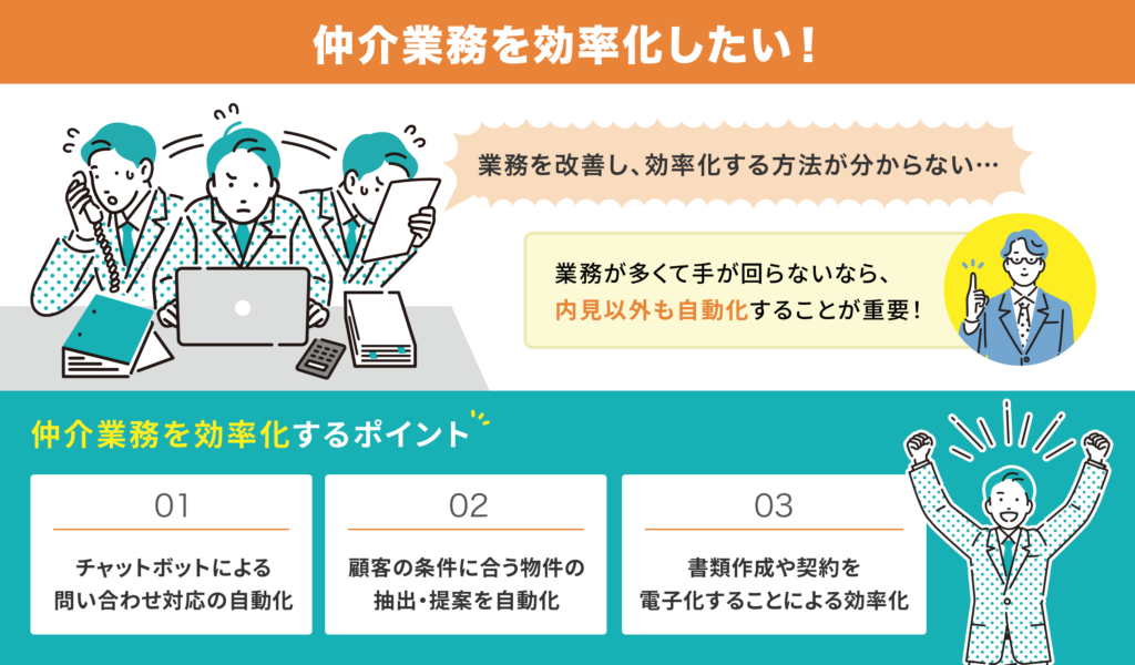 「オンライン内見」や「VR内見」といった取り組みはすでに広まっていますが、それだけでは業務全体の効率化には限界があります。