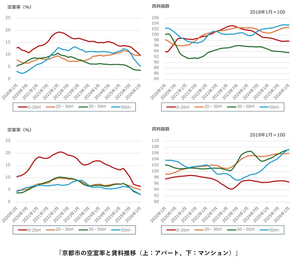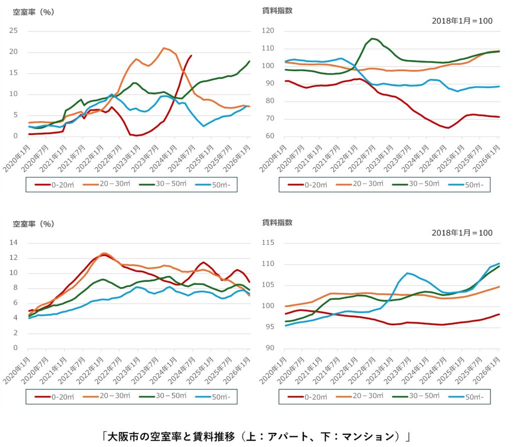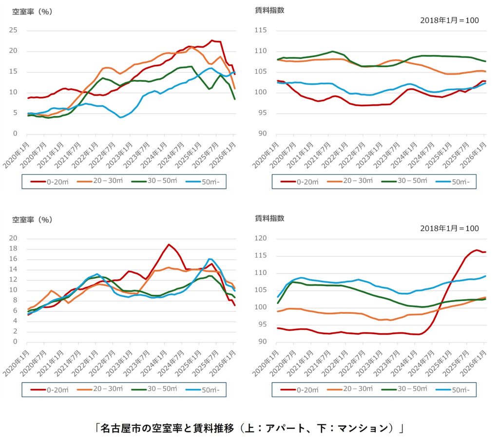 名古屋市では、アパート・マンションの0-20㎡、アパートの50㎡-で前月比の空室率が悪化、その他は改善しました。支払い賃料は、アパート・マンション共にカップル向けの30-50㎡が前月比で下落しています。アパートについては、前年同月比も下落しており、家賃を下げて空室を埋めている物件が増加している可能性が考えられます。2025年半ばから上昇傾向となっていたマンションの0-20㎡の支払い賃料は2026年10月をピークに下落に転じています。名古屋市の需給ギャップは2023年3月以降縮小(需要過多)傾向にありましたが、2025年7月をピークに拡大(供給過多)傾向に転じています。マンションの0-20㎡の支払い賃料の推移は需給ギャップの推移に若干遅延しています。愛知県に本社のあるトヨタ自動車は好調を維持していますのでトヨタ関連の企業等の従業員増加による社宅需要上昇、0-20㎡の物件の建て替えが進んだ等が要因と考えられます。