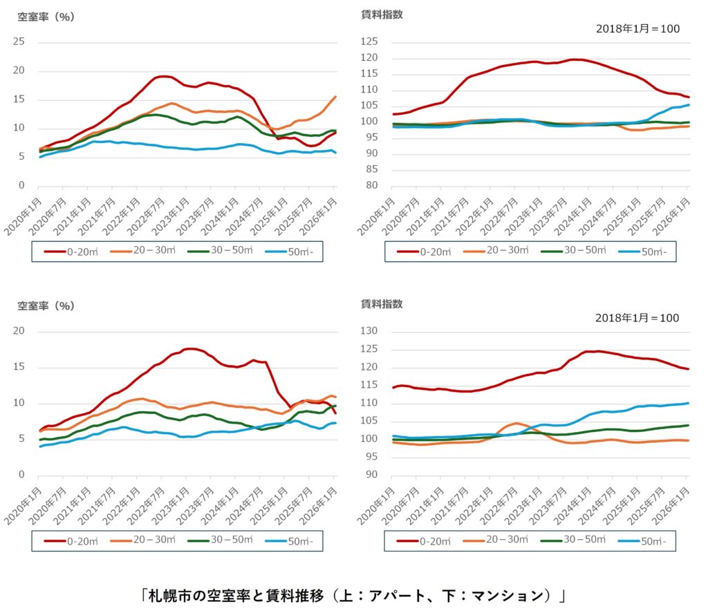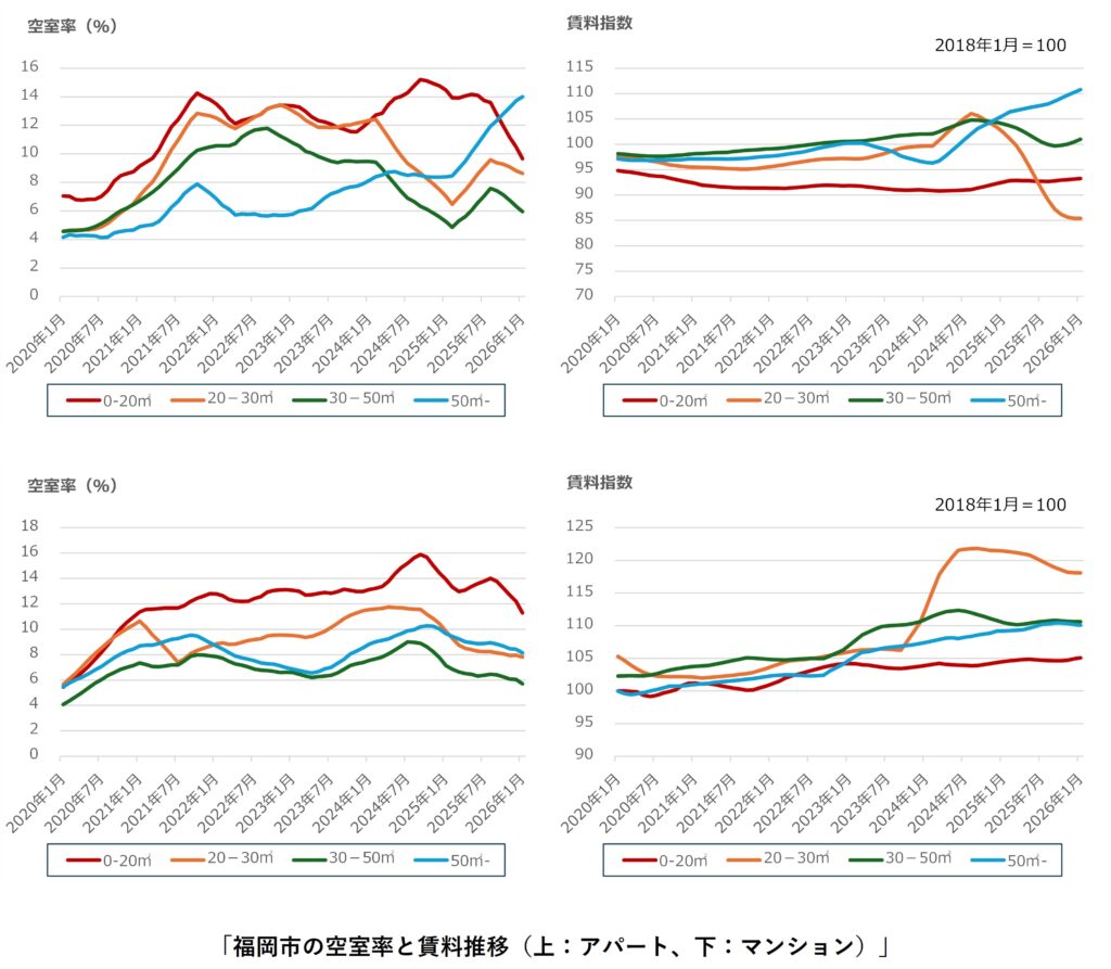 福岡市ではアパートの50㎡-の空室率の悪化が継続しています。アパートの50㎡-の支払い賃料は2024年以降に急上昇しており、空室率はその1年後の2025年以降から急上昇しています。支払い賃料の上昇で、賃料差の縮小したマンションが選好されるようになった、分譲マンションや戸建てと競合が生じるようになった等の要因が考えられます。福岡市の需給ギャップは2024年半ばから拡大(供給過多)傾向に転じています。時期を同じくして、アパート・マンション共に20-30㎡の支払い賃料が下落傾向となっていることから、需給ギャップ拡大の要因が単身者向けの供給過多であった可能性が考えられます。