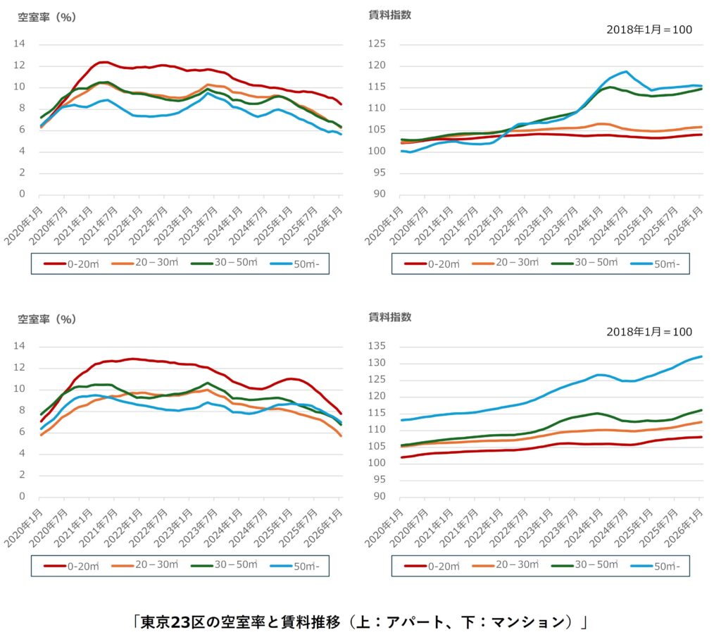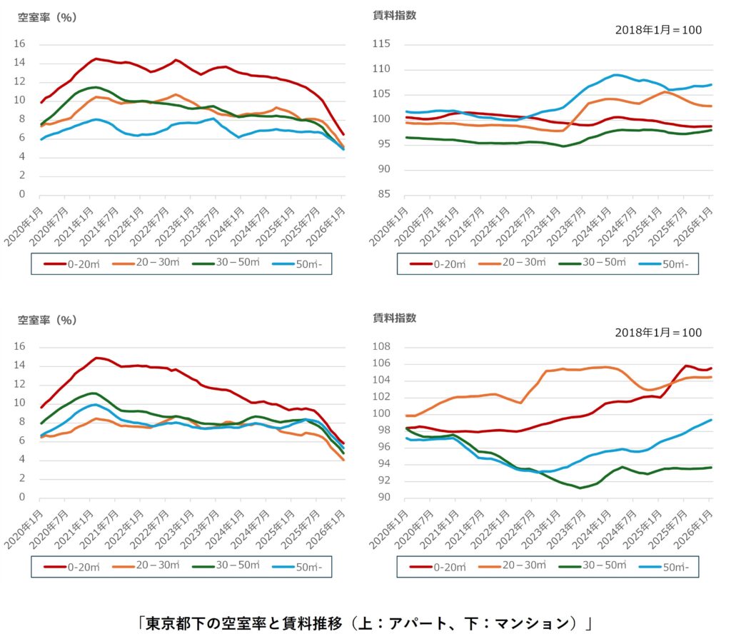 東京都下では、アパート・マンション共に、全面積帯で空室率の改善が継続しており、家賃の高い東京23区を避けたいと考えるテナントの受け皿になっていることがわかります。