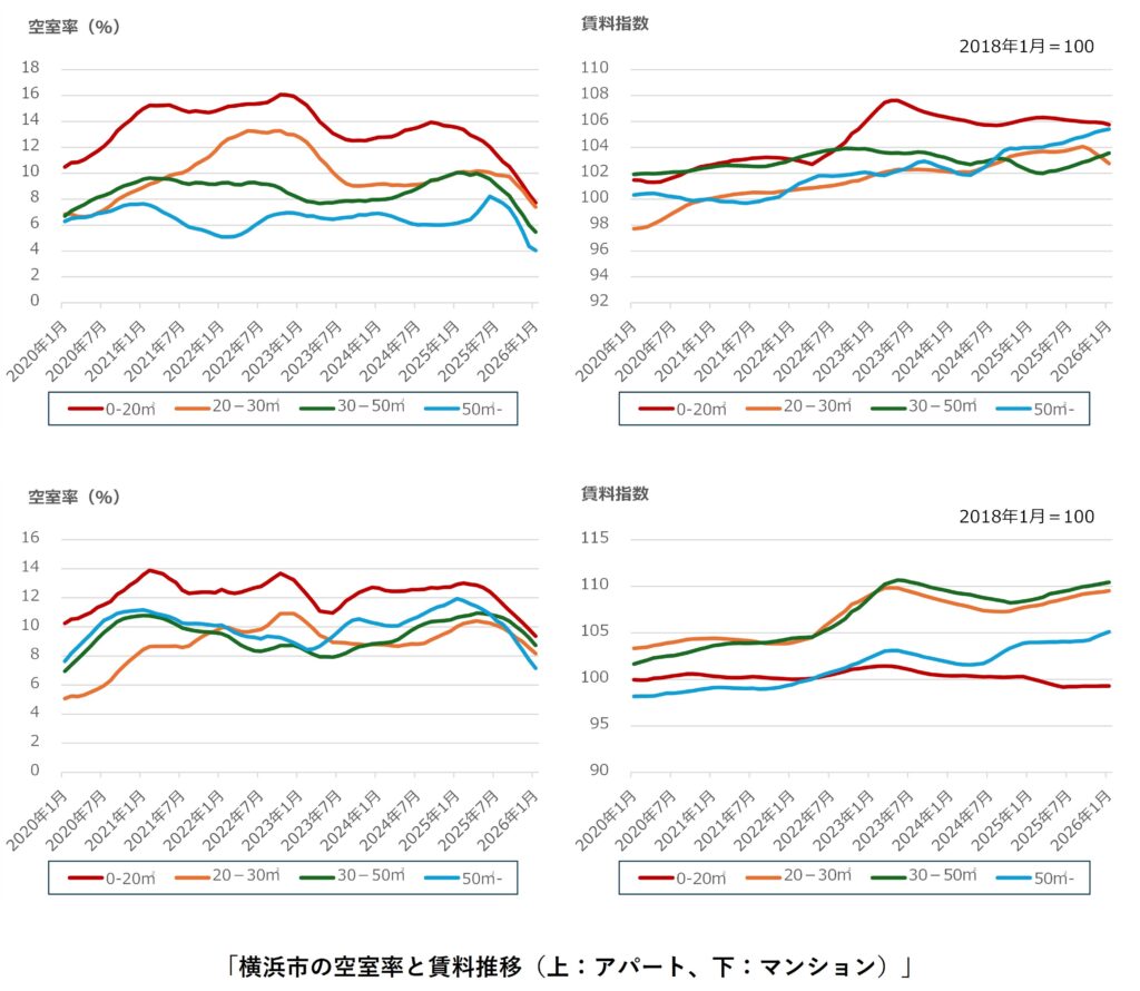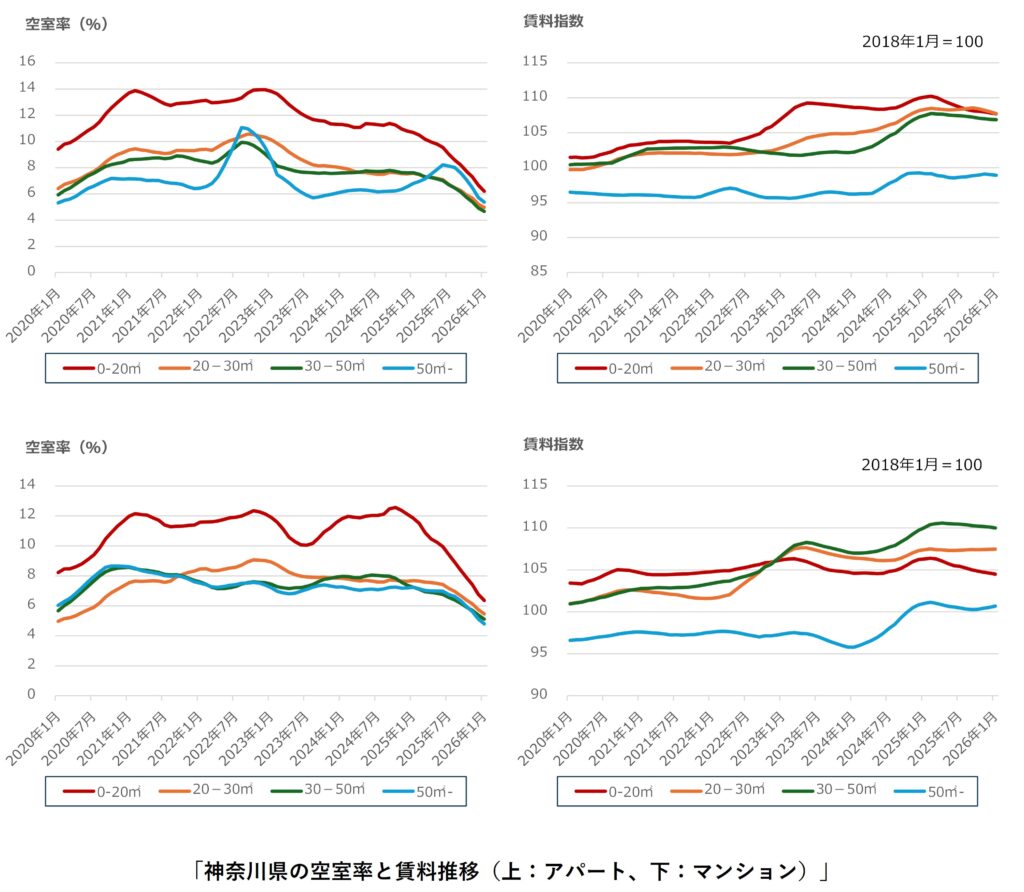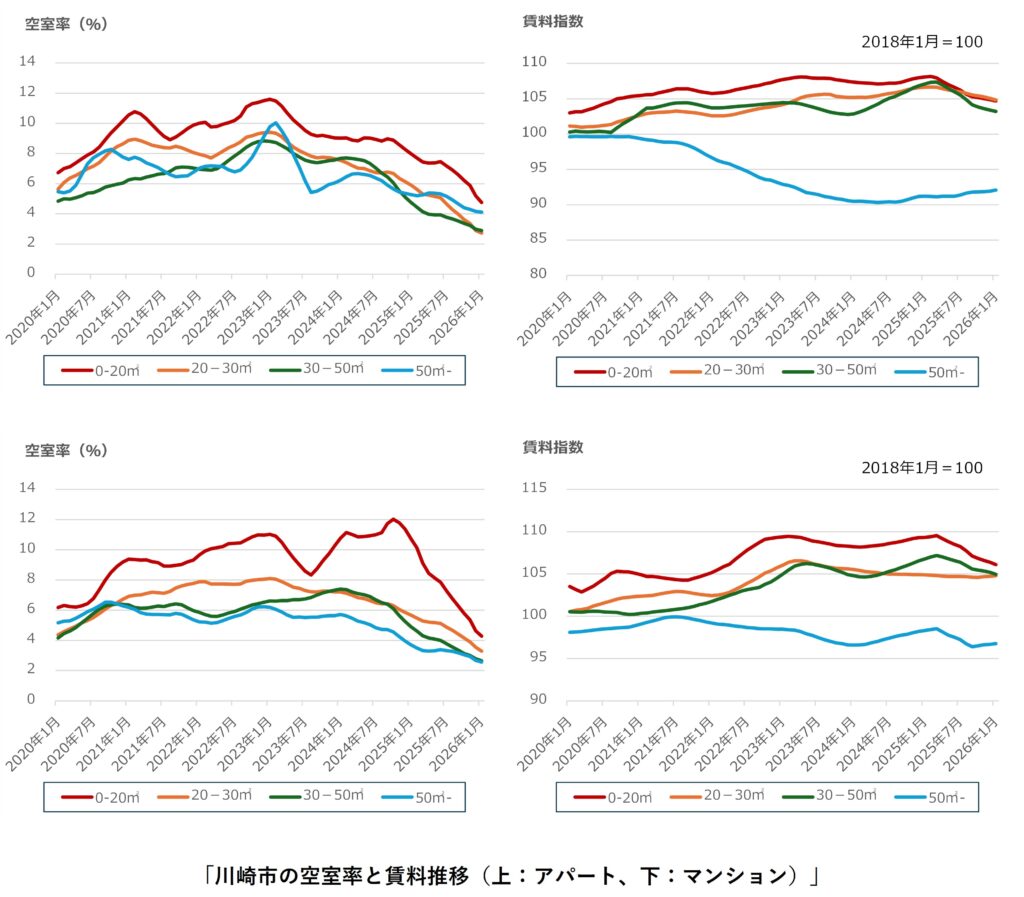 川崎市では、アパート・マンション共に、全面積帯で空室率の改善が継続しています。