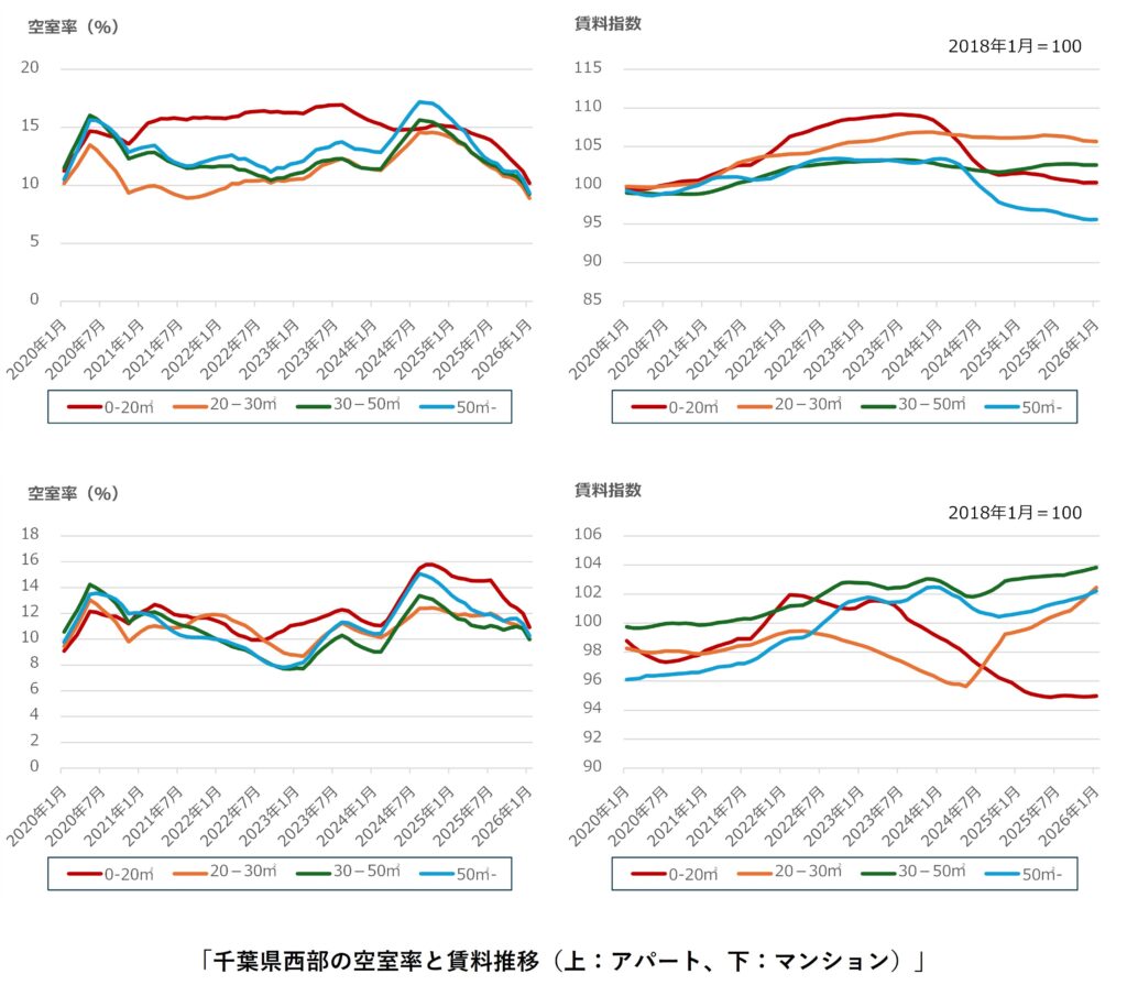千葉県西部(柏市、松戸市、流山市、我孫子市、市川市、浦安市、習志野市、船橋市)、アパート・マンションのすべての面積帯で空室率の改善が継続しています。一方で、アパートの支払い賃料は、0-20㎡を除いて前月比で下落、30-50㎡を除いて前年同月比で下落しており、家賃の高い物件が敬遠され始めている、もしくは築古の物件や交通利便性の悪い地域の物件が家賃を下げて空室を埋めている等の可能性が考えられます。マンションは全ての面積帯で前月比の支払い賃料が上昇しましたが、0-20㎡の支払い賃料の水準は2018年1月の水準を大きく下回っており、賃料を下げて空室を埋めている可能性が考えられます。