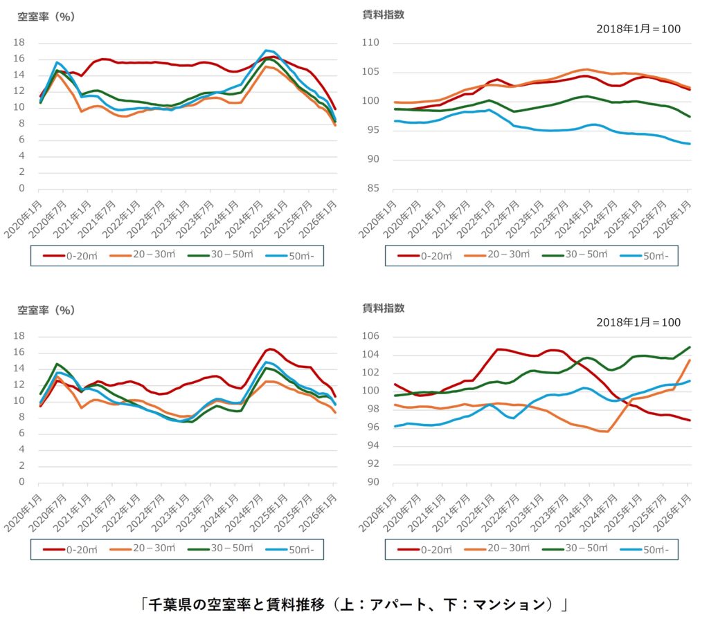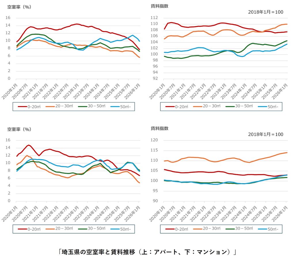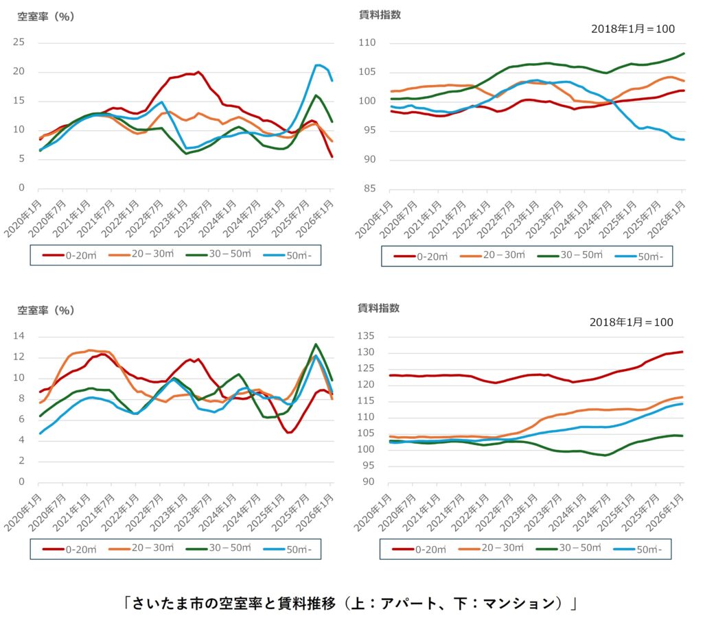 さいたま市ではアパート・マンションのすべての面積帯で空室率の改善が継続しています。アパートの20-30㎡、50㎡-、マンションの30-50㎡で前月比の支払い賃料が下落したものの、前年同月比の支払い賃料はアパートの50㎡-を除いて上昇傾向を維持しています。アパートの50㎡-の支払い賃料は2023年半ば以降下落が継続しており、2018年1月の水準を大きく下回っています。交通利便性の悪い地域の物件が家賃を下げて空室を埋めている可能性があります。