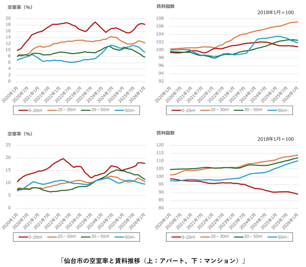 仙台市では、アパート・マンション共にすべての面積帯で空室率が前月比で改善しました。ただし、面積の狭い単身者向けの0-20㎡の空室率はアパート・マンション共に高い水準で推移しており、供給過剰となっていると考えられます。0-20㎡は支払い賃料も下落傾向となっており、アパートは2018年1月とほぼ同じ水準、マンションは2018年1月よりも10%以上低い水準まで下がっています。対して、面積の広い単身者向け20-30㎡の支払い賃料はアパート・マンション共に上昇傾向で推移しており、仙台市の賃貸住宅市場では、単身者は面積の広い部屋を選好していると考えられます。また、東日本大震災の影響もあり、全面積帯で、アパートよりも堅牢なマンションが選好されていることがうかがえます。