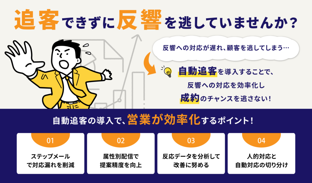 自動追客の効果を最大限に引き出すためには、次のような運用の工夫が必要です。こうした工夫により、ただの「自動化」ではなく、“戦略的な営業支援”として機能します。