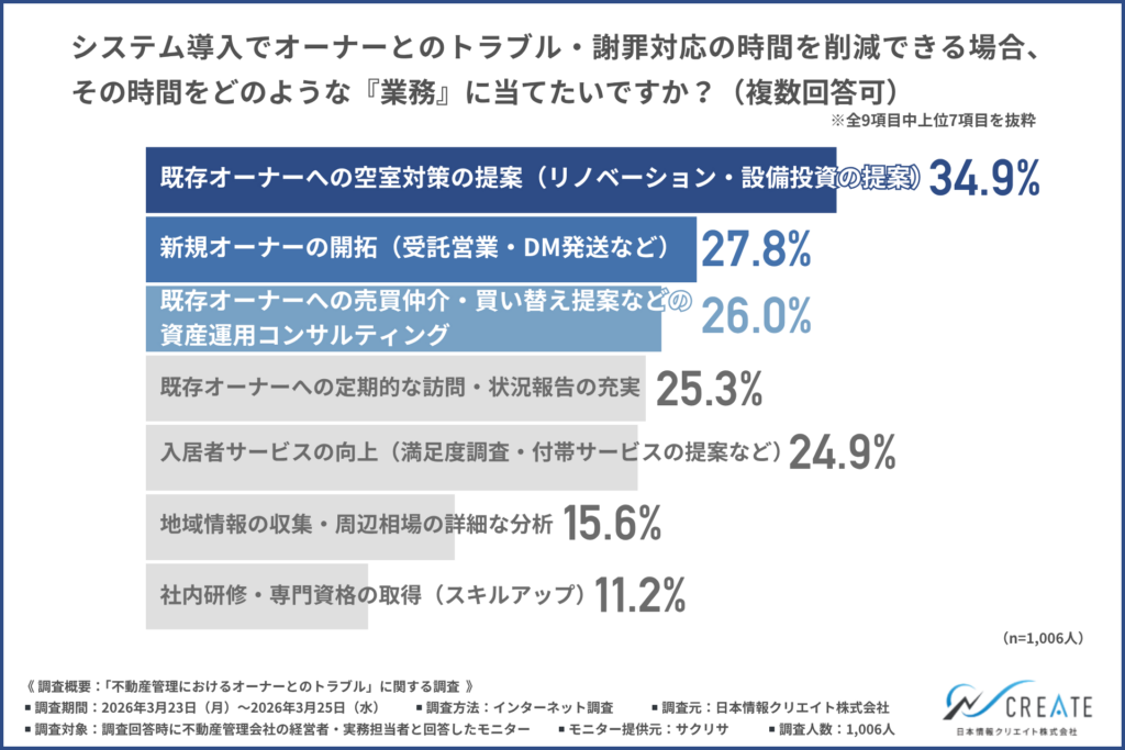 「システム導入でオーナーとのトラブル・謝罪対応の時間を削減できる場合、その時間をどのような『業務』に当てたいか」と尋ねたところ、『既存オーナーへの空室対策の提案(リノベーション・設備投資の提案)(34.9%)』と回答した方が最も多く、『新規オーナーの開拓(受託営業・DM発送など)(27.8%)』『既存オーナーへの売買仲介・買い替え提案などの資産運用コンサルティング(26.0%)』となりました。