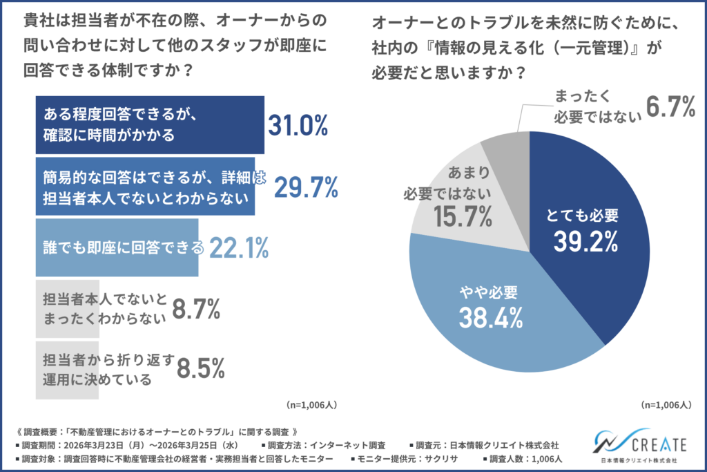 「オーナーとのトラブルを未然に防ぐために、社内の『情報の見える化(一元管理)』が必要だと思うか」と尋ねたところ、約8割が『とても必要(39.2%)』『やや必要(38.4%)』と回答しました。