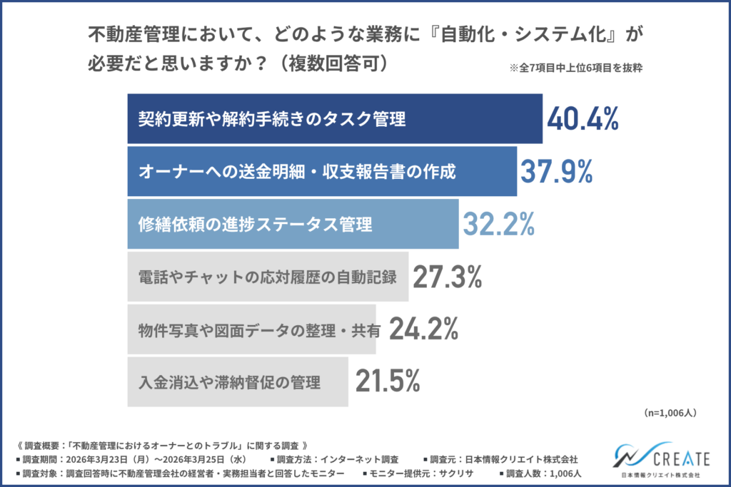 また、「契約更新や解約手続きのタスク管理」「収支報告書の作成」「修繕依頼の進捗ステータス管理」といった人的エラーが発生しやすい業務の自動化・システム化も必要とされています。