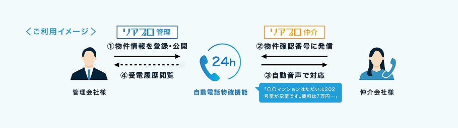 リアプロ掲載物件を利用し、仲介会社からの物件空室情報に関する電話に、自動音声で応答する機能です。これまでは、物件の最新状況を確認するために、管理会社へ電話で問い合わせる必要がありました。本機能の追加により、元付会社は物件空室確認に伴う電話対応の業務時間や対応コストを削減できます。また、仲介会社は時間帯を気にすることなく、24時間いつでも物件確認が可能になります。