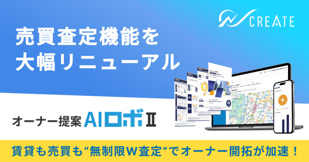 不動産テックを推進する日本情報クリエイト株式会社(本社:宮崎県都城市、代表取締役社長:辻村 都雄、以下「日本情報クリエイト」証券コード:4054)は、不動産テック事業を展開する独立系スタートアップのStudio LOC(スタジオ エルオーシー)合同会社(本社:東京都台東区、代表社員:長田 幸洋、以下「Studio LOC」)との共同開発により制作した、賃料査定・空室対策提案ツール「オーナー提案AIロボⅡ」の売買査定機能が2026年4月21日(火) に大幅リニューアルをしました。これにより、1つのシステムで賃料査定と売買価格査定の両方(以下「W査定」)を、月1万円から回数無制限※で行うことが可能となりました。